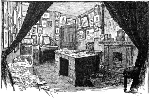 and religiously drops a line," during the time he is not wanted in the piece, to all those unknown "young friends" who would tempt good fortune on the stage; the sofa covered with flowered cretonne; and in close proximity to the fireplace a ricketty arm-chair in brown leather. The springs are broken, but what matter? That chair is Toole's, sir, and Royalty has occupied it many a time. Yes, nothing could be more simple than our own comedian's dressing-room. It is just a cosy parlour, and with Toole in the chair by the fire-side one would be loth to leave it.