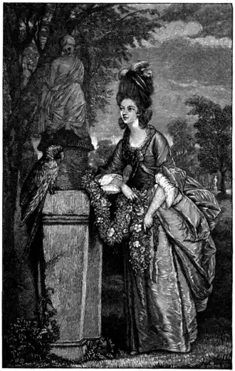 The other is that of Miss Gale, painted when she was fifteen, a canvas worth at least £5,000 (page 232). She married Admiral Gardner, who was so much attached to his wife, that whenever he went to sea he always took the picture with him, and had it conspicuously hung up in his cabin. His vessel was wrecked off the West Indies, and though the Admiral was saved, the ship, with "Miss Gale" in the cabin, went down. There it lay at the bottom of the ocean for a considerable period, until at last attempts were made recover it. This was successfully accomplished, though the canvas was much damaged, and afterwards reduced in length and breadth. The picture seems to have been peculiarly unfortunate, both on land and sea, for in 1864 it was damaged again by the Midland Railway. Until recently it was in the possession of the Rev. Allen Gardner Cornwall.