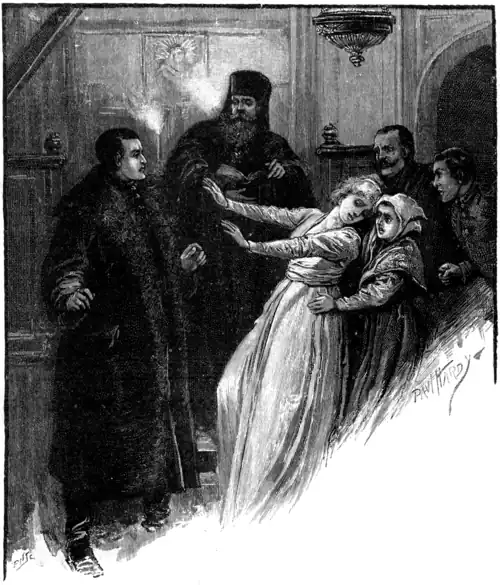"I got out of the sledge in silence, and stepped into the church, which was dimly lighted with two or three tapers. A girl was sitting in a dark corner on a bench; another girl was rubbing her temples. 'Thank God,' said the latter, 'you have come at last! You have nearly been the death of the young lady.'