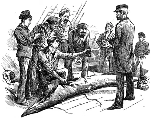 Some of the men laughed, but my manner was so earnest, that in a moment they all set about to help me. A small boat was lowered, lines were made fast to the dead fish, and, with block and tackle, we hauled him on deck. I then got a butcher's knife from the cabin, and began to cut him open.