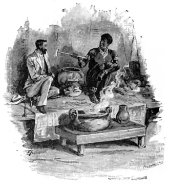 But by the time I had revolved these things in my mind four or five natives entered bearing wooden trays on which were roasted yams, breadfruit, young cocoanuts, sugar cane, plantains, roasted wild hog, and some kind of fish baked in leaves. And bringing up the rear was a woman carrying on her head a huge calabash which, as she lowered it to the ground, I saw was filled with crystal water. These things were placed between me and the chief, and by signs he invited me to fall to. When I learned that I was not to be used as the material for a feast but to be feasted instead, my mind was considerably relieved, and I set to work on the good things provided with a very keen appetite In a few minutes two other women entered bearing between them suspended from a bamboo, a large earthenware pot, in which was something smoking hot. This pot was set before us, and into it the chief plunged a wooden skewer; bringing up a piece of white round