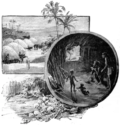 When the important ceremony of dining was over, I rose with a tighter waistband than I had had for weeks; and I gave my entertainer to understand that I should like to see the village. Thereupon he gave some instructions, and led the way outside, and I wandered about the village for some little time. The huts I noted were built in clusters. They were formed by digging a pit that was plastered with wet mud like cement, and allowed to dry in the sun. Then above this pit was reared a roof of sticks and leaves, the top being rounded off