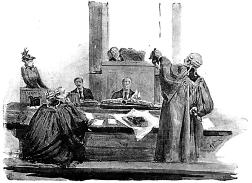Sometimes the proceedings are relieved by an amusing scene, such as that shown in our illustration, where a voluble young lady is sued for the price of a pair of boots, which she declares to be a misfit. "They are too large," she persists. "She said she would not have them if they were tight," the plaintiff protests. Such an opportunity to bring off smart witticisms is not neglected by the counsel on either side. Eventually