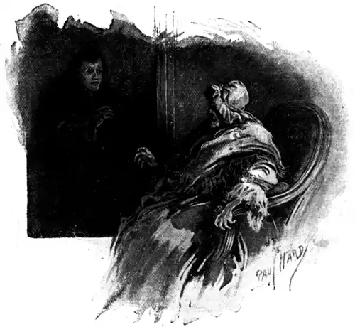 The walking mummy sank into a large Voltaire arm-chair. Hermann looked through the crack in the door; he saw Lisabeta pass close to him, and heard her hurried step as she went up the little winding staircase. For a moment he felt something like remorse; but it soon passed off, and his heart was once more of stone.