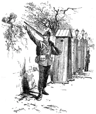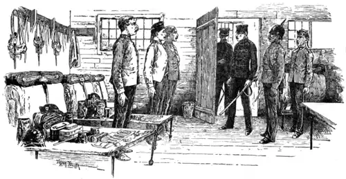 about a quarter of an hour, and from 6 o'clock to a quarter to 8 we were furbishing up our uniforms, and paring the potatoes for the mess, the allowance being a pound for each man. We found this work rather irksome, and would have shirked it. Dapper wanted to know why they could be not cooked with their jackets on. Our sergeant was most sympathetic, and generally called one or both of us off to send us on some errand like fetching the letters, which was more to our tastes, and Dick was able now and then to add to his miniature sketch bookâhe was very clever with his pencil.