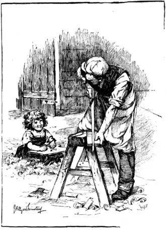 radiant with sunshine. She prattled to him as he worked at the bench; had her own hammer and her own piece of wood to knock imaginary tacks in; and began to be ambitious of the use of chisel and saw—an ambition which Sim would artfully counteract by the opportune provision of putty and like harmless material.