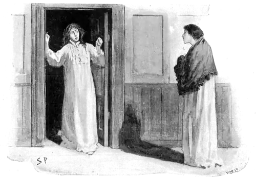 seemed to hear a low whistle, such as my sister described, and a few moments later a clanging as if a mass of metal had fallen. As I ran down the passage my sister's door was unlocked, and revolved slowly upon its hinges. I stared at it horror-stricken, not knowing what was about to issue from it. By the light of the corridor lamp I saw my sister appear at the opening, her face blanched with terror, her hands groping for help, her whole figure swaying to and fro like that of a drunkard. .png)