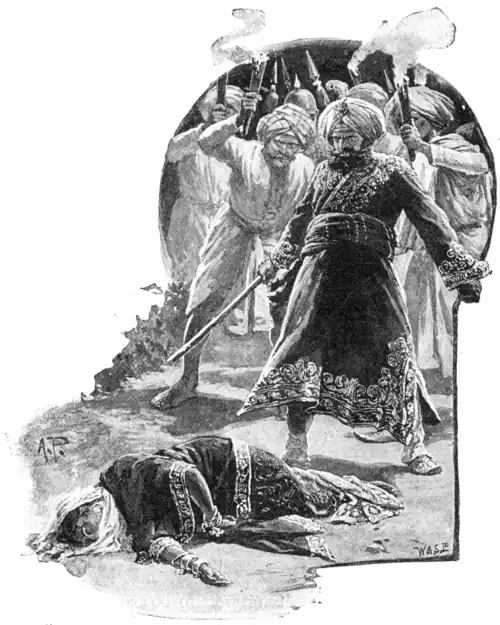 Again her husband's only reply was a savage blow that once more felled her to the ground. Then, ordering some of the servants to convey her to her chamber, he told others to follow him. And he made his way to the courtyard, and to the quarters occupied by the guard of the Palace. His object was to see Saadut's father, and compel him to produce his son; for Naudba's spies, who had conveyed the information that the Princess had escaped from her room, also stated that Saadut was the lover. But what was Chundra's surprise, when he reached the guardhouse, to find the youth calmly seated, surrounded by companions, to whom he was singing. For the moment the Prince's suspicions were allayed, so far as the lad was concerned. He thought that he must have been misinformed; and, without speaking, he strode back to the Palace, still maddened with jealous rage.