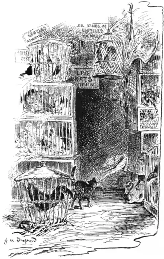 Dear old Ship Tavern Passage! Cumbered with cages, boxes, and baskets, littered with straw, sand, and sawdust; filled with barks and yelps, crows and clucks, and the smell of mice and rabbits! What living thing, short of a hippopotamus, have I not bought there in one of those poky little shops, the door to which is a hole, framed round with boxes full of living things, and guarded by tied dogs perpetually attempting to get at each other across the opening. In the days when the attic was devoted to surreptitious guinea-pigs, when white rats escaped from the school desk, and when grown sisters' dislike of mice seemed insane, then was Ship Tavern Passage a dream of delight.