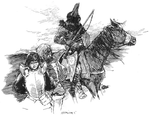 They were barely allowed a few days of rest, in which to recover from their wounds. Then, when their new master was assured there was no longer danger of their dying by the way, he ordered them to be chained together. With a score of others, also linked in pairs, and attached by the centre of their fetters to the stirrup of a Tartar horseman, who bore a lance in his hand, a bow at his saddle, and a quiver of arrows at his back, they were driven onward, with curses and rough blows, towards their captor's home.