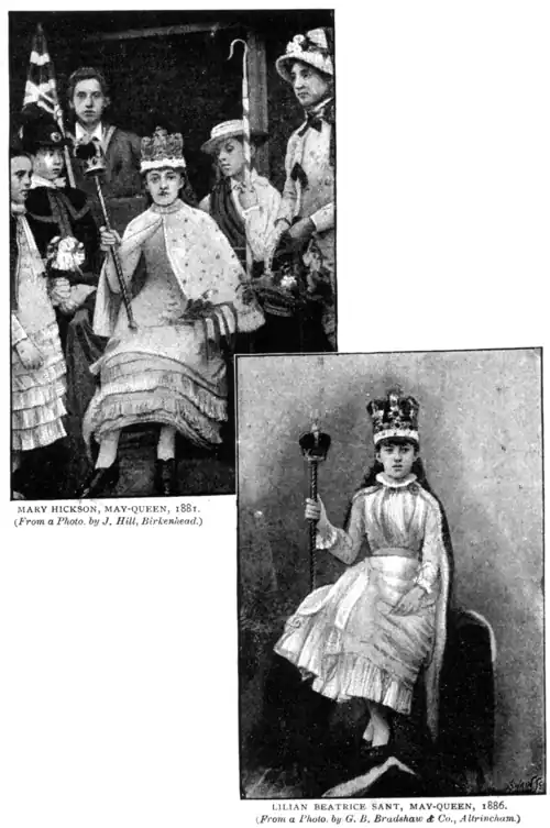 E make bold to say that nowhere is May-Day kept with such real zeal, earnestness, and splendour, as at the quaint old Cheshire town of Knutsford. Though, owing to the extreme changeableness of our climate, the first of May is by no means a taste of the poet's "Gentle Spring," yet, never daunted, the plucky people have kept up this rural fête, despite all kinds of weather, with a resolution to be jolly worthy of Mark Tapley. Indeed, our usual English May-Day is but too often a shivering time, but fitfully cheered by occasional gleams of the sun. Yet the "Queen" and all the happy youngsters, some hundreds in number, who compose her Court, shrink not from the procession to the scene of the coronation, but enter heartily into the spirit of the entire affair. One year, the writer distinctly remembers how the slate-coloured sky threatened the pageant, and at three o'clock, as the Queen was crowned, a brief but terrific hail-storm burst over the ground.