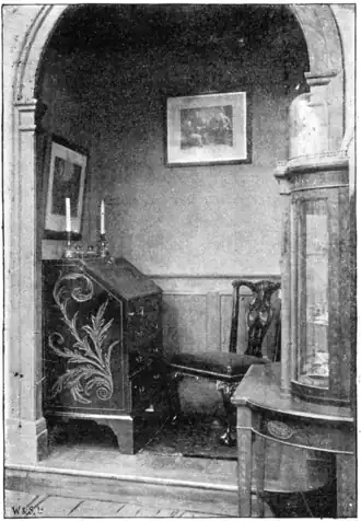 The drawing-room is a delightfully cosy apartment, with its white enamelled chimney-piece and its inviting cushioned corners. Knick-knacks in china fill the recesses; more curios from distant climes, amongst which is a little glass photo of a small child in a plaid frock—an early portrait of Rider Haggard. Mexican combs, exquisite embroidery and fans, are picturesquely scattered about, and freshly plucked flowers