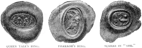 reads, "Ank Bes, Bes Ank" ("the living Bes, Bes the living"). It has been mended. Mr. Haggard wore it for a year, but unfortunately he broke it whilst getting out of a cab. Queen Taia must have worn it all her life, for it shows signs of constant use. Then Mr. Haggard takes from his finger a signet ring he always wears. It was found at Deir-el-Bahari. Its red stone is believed to chronicle the portrait of Rameses the Great, the Pharaoh of the Oppression, with whose coffin it was discovered.