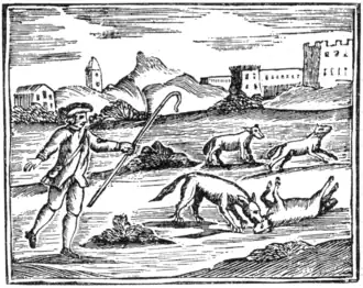 Then there is the shepherd boy who cried "Wolf!" There are four animals in the picture, and anybody can see at once which is the wolf, because he is biting the countenance of one of the others, which lies on the ground; otherwise it would be difficult. The shepherd seems to be rather enjoying the fun, to judge by the gratified look on his face, and the gladsome expressions of his legs