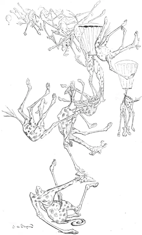 probably giraffes soon will be seen here again. They are becoming rare even in their own habitat, and an African hunt would be a long and trying one. However, a giraffe is still to be had, and the time is distant when we shall become dependent for the supply upon a forlornly possibly giraffe shower. Fish, frogs, and insects in showers are not unknown, while cats and dogs are proverbial. Waterspouts cause these fish and frog showers; in a giraffe transaction it would be necessary to charter rather a strong waterspout, and to stay indoors awhile; all a serious possibility considered from a Maundevillian standpoint.