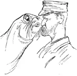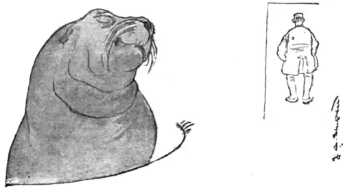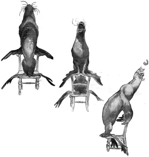 Toby, however, provides the great seal-feeding show. Toby has a perfect set of properties and appliances for his performance, including a chair, a diving platform, an inclined plane leading thereunto, and a sort of plank isthmus leading to the chair. He climbs up on to the chair, and, leaning over the back, catches as many fish as Sutton will throw for him. He dives off the chair for other fish. He shuffles up the inclined plane for more fish, amid the sniggers of spectators, for Toby's march has no claim to magnificence. He tumbles himself unceremoniously off the platform, he clambers up and kisses Sutton (keeping his eye on the basket), and all for fish. It is curious to contrast the perfunctory affection with which Toby gets over the kiss and takes his reward, with the genuine fondness