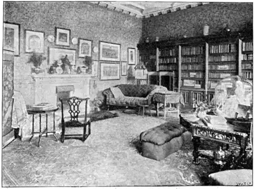 sound of the chapel organ was heard. Its echo came very sweetly through the corridor. It was the time of evening service. The dim glow from the lamps lent an air of solemnity to the little chapel, and when the service was over we remained behind for a few moments. I could just distinguish the altar steps of white, black and red—the Dante combination of colours—and the peaceful light from the moon streamed through the stained glass windows on to the oaken stalls, showing faintly the outlines of apostles and saints. One of these was put up in 1852, in remembrance of the Rev. Charles Dodgson, examining chaplain to Bishop Longley and the father of the author of "Alice in Wonderland." It was here in the morning that I witnessed the gathering together of twenty or thirty clerics, who were licensed to new curacies and livings. We left the chapel, and ascending the great oaken staircase entered the study. This is essentially a room for work. The bookshelves contain some thousands of volumes—the only photo about the place is that of a family group. In one corner of the room stands a tin box, in which are three volumes of autographs, and the pages of these valuable volumes may be gone through, and the autographs of nearly all the Archbishops and Bishops of England for the last 200 years may be seen, including Juxon, Bishop of London, who attended Charles I. on the scaffold. A book containing photographs of the churches in the diocese reveals that Bishop Longley—the first Bishop of Ripon—was of a distinctly practical character. He started this ingenious index to the state of his churches. As soon as any alteration is made in a place of worship it is photographed. This shows the Bishop at a glance exactly how his churches are progressing from an architectural point of view.