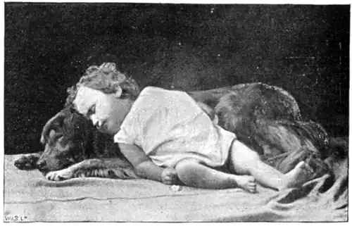 Here they come—the fifty yards' race down the corridor; a dozen of the very smallest crawling along, chuckling and screaming with excitement. Frank leads the way. Artful Frank! He is off bottles now, but he still has an inclination that way, and, unless his miniature friends and acquaintances keep a sharp look-out, he annexes theirs in the twinkling of an eye. But, then, Frank is a veritable young prize-fighter. And as the race continues, a fine Scotch collie—Laddie—jumps and flies over the heads of the small competitors for the first in to lunch. You don't believe it? Look at the picture of Tommy lying down with his head resting peacefully on Laddie. Laddie! To him the children are as lambs. When they are gambolling in the green fields he wanders