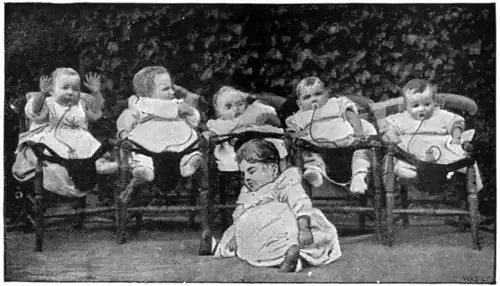 I went upstairs with Sister Alice to the nursery. Here are the very smallest of them all. Some of the occupants of the white enamel cribs—over which the name of the babe appears—are only a very few weeks old. Here is Frank in a blue frock. It was Frank who came in the condensed milk box. He is still at his bottle as he was when first he came. Sleeping opposite each other are the fat lady and gentleman of the establishment. Annie is only seven months and three days old. She weighs 16lb. 4oz. She was bathed later on—and took to the water beautifully. Arthur is eleven months. He only weighs 22lb. 4oz.! Eighteen gallons of milk are consumed every day at "Babies' Castle," from sixty to seventy bottles filled per diem, and all the bottle babies are weighed every week and their record carefully kept. A glance through this book reveals the indisputable fact that Arthur puts on flesh at a really alarming rate. But there are many others who are "growing" equally as well. The group of youngsters who were carried from the nursery to the garden, where they could sit in their chairs in the sunshine and enjoy a quiet pull at their respective bottles, would want a lot of beating for