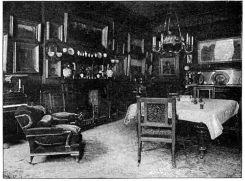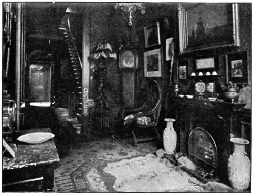 The entrance to the dining-room is typical of all the other door decoration in the house—a carving of cream enamel of beautiful design and workmanship. The walls of this apartment are terra-cotta, with a finely carved oak-panelling. It is a little treasure room of canvases, the gem of which is probably C. Van Hannen's "Mask Shop in Venice"—a painter of a school which Luke Fildes, R.A., has done so much to popularize. Macbeth is represented by a couple of delightful efforts, and there are samples of the skill of Eugene Du Blas, Crofts, John Reid, Andriotti, Sadler, De Haas, Rivers; a grand landscape by Webb—nearly all of which are Academy works. The decorative articles are as artistic as in some cases they are peculiar. Running about above the oaken fireplace, amongst choice bronzes and blue ware, and a black boy who is trudging along with a very useful clock on his back, are many quaint animals of polished brass—even mice are not missing, with wonderfully long tails—that sparkle and glisten in the fire-light. Ascending the staircase you find etchings