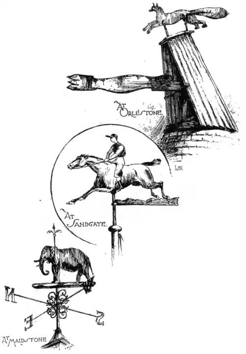 Dover, too, has its share of interesting vanes; perhaps the one belonging to to St. Mary the Virgin is the best. It is attached to an old lead-covered spire surmounting a decorated Norman tower with rich exterior arcading, practically untouched by the unloving hand of the so-called "restorer"; but there are several others in the older streets of the town well worth noting.