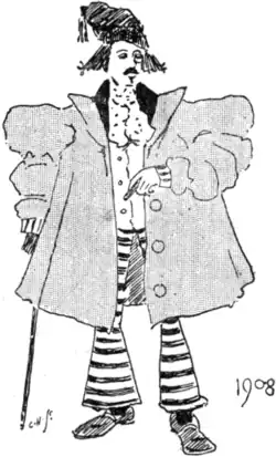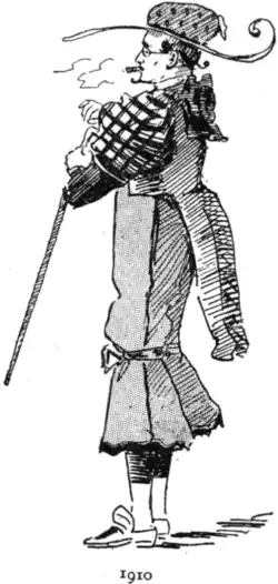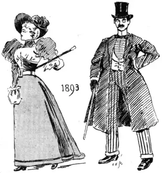 The first plate in the book is dated 1893, and serves as a frontispiece. The costumes of the lady and gentleman are familiar enough, although we note with surprise that the gentleman's coat-tails seem to have a crinoline cast, and if the turned-up bottoms of his trousers are a little mortifying, it is atoned for by a triumphant attitude which disarms hypercriticism. Also the lady's posture makes it difficult for us to tell whether it is a stick or an umbrella she is carrying.