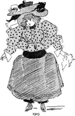 There is a pictorial hiatus of some years, but the text notes that crinoline for women enjoyed a sway of some years' duration. For, taking the tracings from the plates in the order in which they are given in the book, we find a subdued form of the article in the female costume for 1905. The ladies may well regard this plate as astounding. There is even a suggestion of "bloomer" about its nether portion, and if the hat is not without precedent in history, the waist is little short of revolutionary.