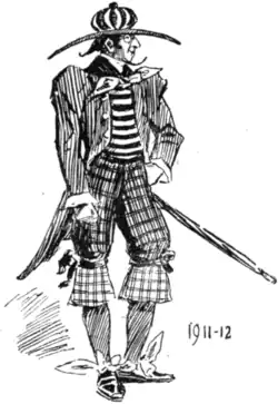 A further glance at the costume for the swells between 1902 and 1912 reveals the existence of an entirely novel adjunct to the male attire. Silk bows have been worn about the neck for nearly, if not quite, a century, but never in the body of the attire. It is true the gentleman as early as 1910 adorns his nether garments with a plain silk band, but in the elderly party of 1911 he has assumed gay ribbons for his shoes as well as at his knees and throat. In this plate we greet the presence of an unmistakable umbrella as a good omen. But it is only a short-lived rapture, for the spruce young party in the next sketch is balancing lightly between thumb and forefinger what we take to be nothing more or less than a shepherd's crook. This is hardly an edifying prospect. Yet if we do not altogether mis-