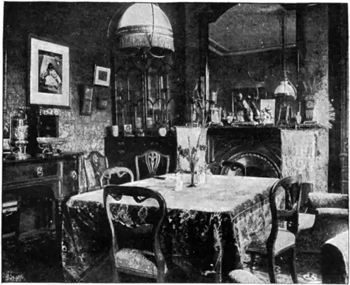 In the dining-room Landseer, Herkomer, Alma Tadema, and Burton Barber are represented—little Lawrence was the original study for the child in the latter artist's "Bethgelert." Fred Barnard's work is here, and some quaint old original designs on wood by Boyd Haughton are pointed out as curios. Punch is to the front, notably in Du Maurier, by himself, which cost its its possessor thirty guineas; a portrait group of the staff up the river, some delicate water-colours by C. H. Bennett, and a fine bit of work by Mr. Furniss of the jubilee dinner of the threepenny comic at the Ship Hotel, Greenwich. Upstairs the children's portraits, and pictures likely to please the youngsters, reappear. The nursery is full of them, though perhaps the most interesting apartment in this part of the house is the principal bedroom. It is full of the original caricatures of M.P.'s and other notabilities, and the occupant of the bed has Bradlaugh and the Baron de Worms on either side of him, whilst from a corner the piercing eye of Mr. George Lewis is constantly on the watch.