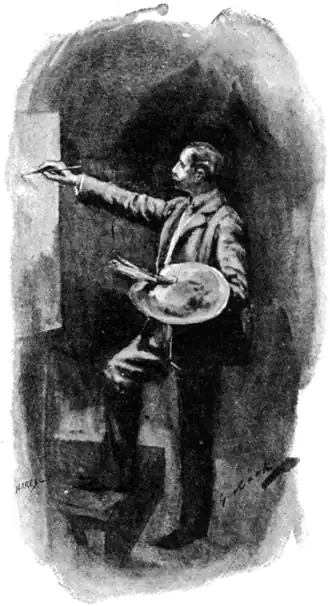 He made no answer. With monotonous step he descended the stairs and was now at the bottom. His blank, staring eyes at once told me that he was in a state of somnambulism. He was fully dressed. His face was deadly pale, his features stolidly set, and his lips were gently moving as though impressively muttering. When he reached the bottom stair, he turned and walked in the direction of the room we had converted into a studio for him. I followed on quietly. With all the method and mysterious discre-