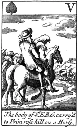 Among the secondary uses to which playing cards have been applied, we find them as political weapons. Among such cards are those which were produced to commemorate what is historically known as the "Titus Oates Plot" in 1678, one of the most prominent incidents being the murder of Sir Edmondbury Godfrey, who is here shown (Fig. 11), carried on a horse, the day after his murder, to Primrose Hill, where the body was put into a ditch, the carrying on the horse and the discovery in the ditch being shown as coincident. They were produced, probably, as one of the means of inflaming the public mind against the Roman Catholics, which led to the execution, among others, of the Viscount Stafford in 1680. As illustration of costume and of stirring incident, these cards are, apart from their intention, an admirable and interesting series, and are worth study from their historic and artistic aspects.