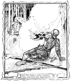 burned up both their shields, and they two fell to the earth in a great swoon; but when they awakened out of it Bors saw that his brother had no harm. With that the voice spoke to him saying, ‘Bors, go hence and bear your brother fellowship no longer; but take your way to the