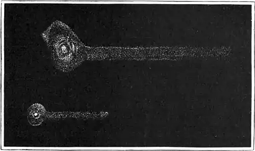seen in observing the great Comet of 1618. In the case of this comet Cysatus noticed an evident tendency in it to break up. When first seen it was a nebulous object, but some weeks afterwards it appeared to consist of a group of several small nebulosities. But the best authenticated instance of this character is that of Biela's Comet in 1845–6. When first detected, on November 28, it presented the appearance of a faint nebulosity, almost circular, with a slight condensation towards the centre: on December 19 it appeared somewhat elongated, and by the end of the month the comet had actually separated into two distinct nebulosities, which travelled