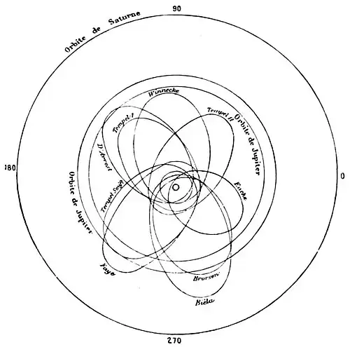 to be moving in an elliptical orbit requiring for a complete revolution only 51/2 years; yet though this comet was a large and bright one it had never been observed before, and it is doubtful whether it has ever been seen since, the reason being that the Planet Jupiter completely changed the character of its path, probably by enlarging it.
