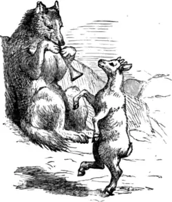 A Kid, returning without protection from the pasture, was pursued by a Wolf. He turned round, and said to the Wolf: "I know, friend Wolf, that I must be your prey; but before I die, I would ask of you one favour, that you will play me a tune, to which I may dance." The Wolf complied, and while he was piping, and the Kid was dancing, the hounds, hearing the sound, came up, and, issuing forth, gave chase to the Wolf. The Wolf, turning to the Kid, said, "It is just what I deserve; for I, who am only a butcher, should not have turned piper to please you."