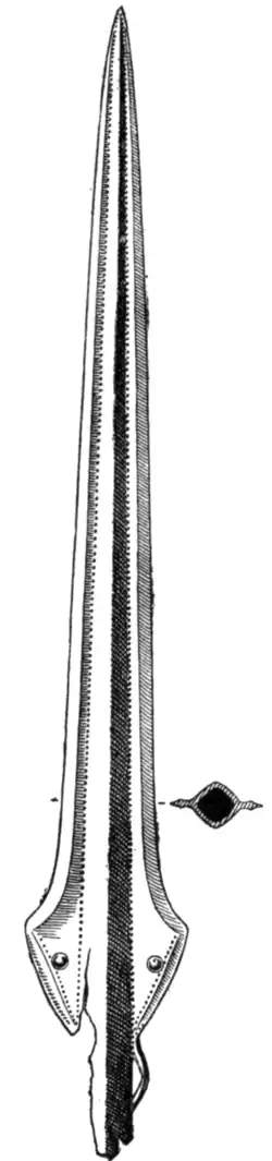 Apart from the special interest of this spear-head as an unusual and artistic production of the bronze age, it has the additional interest of showing how the socketed spear-head was evolved from the sword-like weapon which has- ↑ This is figured in the Guide to the Bronze Age Antiquities in the British Museum, p. 80, fig. 67 (1).