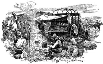 For the first two days the trail led over adjacent ranches and here they had to be careful that other cattle were not drawn into their own herd. Barways also had to be taken down and then put back again. Each day toward sundown a large open field had to be discovered and the cattle turned into it for the night. Here the cow-punchers rode round and round the herd until they had them moving around in a great circle. Little by little this motion lessened until finally the herd was at rest and they were ready for the night. Then the express wagon came up, the tents were pitched, the camp fire was built, and the cow-punchers prepared to eat a hearty evening meal. Whatever they had eaten thus far during the day since breakfast had been taken in the saddle.