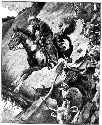 As by a common impulse this brought the cattle to their feet in great alarm and here and there was heard a frenzied bellow. Then again there was that strange lurid light, a great crack in the heavens, and a peal of thunder that was fairly deafening. That was enough for the now nearly frenzied herd and with one accord the entire thousand cattle bolted, with heads down, tails up, and utter terror in the mind of each.