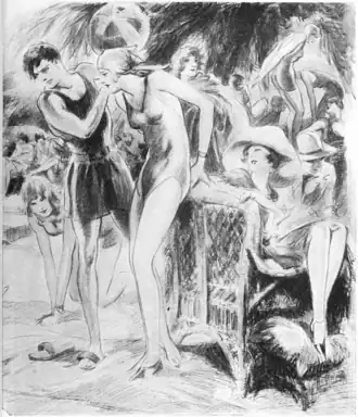 Apparently alone and unattached, it challenged to adventure. Eileen, weary of her aimless troubled stroll down the Santa Monica beach, flung down her yellow flannel bathing cape, and crashed into the curling surf, her slender arms cutting the breakers in a long graceful crawl.
