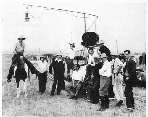 Gary Cooper, as "The Virginian," is a-swingin' along the lonely trail singing a range song to his little pinto hoss, and the faithful outdoor microphone, swung on a crane above his head, catches it all―even the protests of the little pinto hoss