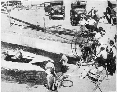 George Lewis speeding through the open sea at fifty miles an hour, in a thrilling race scene from Universal's "Excuse My Spray." Air hoses and a wind machine are whipping the old studio tank into foam, and Director Holmes, with the megaphone, is cautioning George not to knock the concrete down