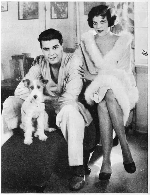 The George Lewises at home, and come right in, folks. The popular Universal star, his wife and their wire haired terrier in a corner of the Lewis residence in Los Angeles