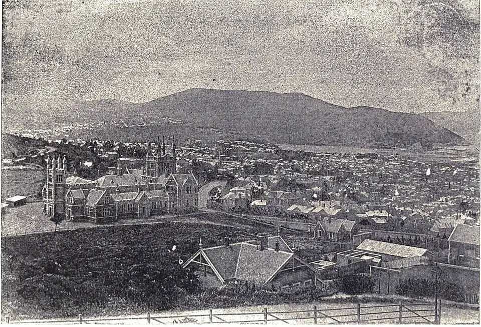 BOY'S HIGH SCHOOL AND DUNEDIN FROM QUEEN'S DRIVE.
