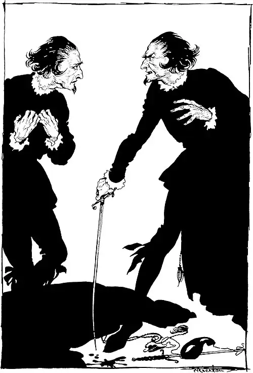 Upon entering, I thrust him furiously from me. He staggered against the wall, while I closed the door with an oath, and commanded him to draw. He hesitated but for an instant; then, with a slight sigh, drew in silence, and put himself upon his defence.