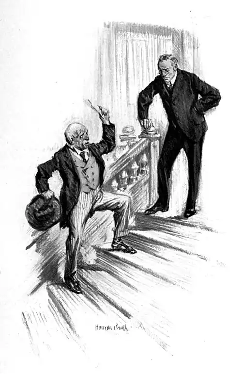 Mr. Gedge-Tomkins came down the staircase, his majestic presence nearly rilling it. "What's that to you, my man?" he bellowed. "Do you think I'm going to spend my day answering the questions of every idle loafer in London?"