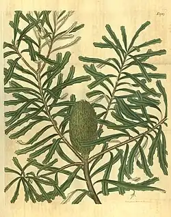 - "Banksia marginata (β) microstachya" described and figured as t. 1947