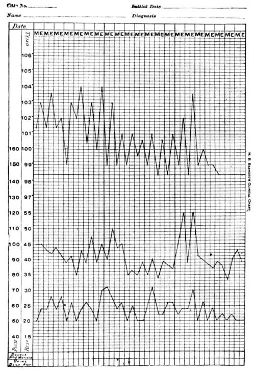 The above diagram is a little more than one-fifth (1-5) the actual site of the chart and shows the method of plotting, the upper curve being the Temperature, the middle the Pulse, and the lower the Respiration. By this method a full record of each can easily be kept with but one color ink.