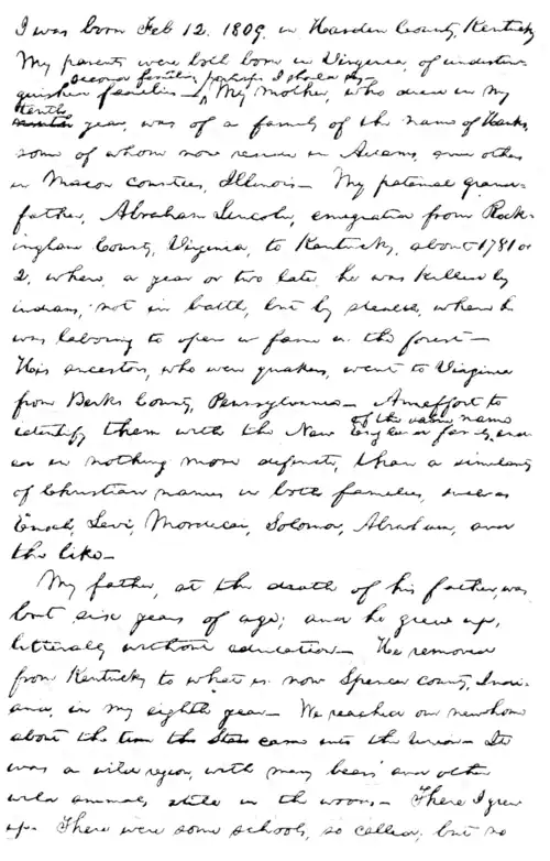 I was born Feb. 12, 1809, in Harden County, Kentucky. My parents were both born in Virginia, of undistinguished families—second families, perhaps I should say. My mother, who died in my tenth year, was of a family of the name of Hanks, some of whom now reside in Adams, some others in Macon counties, Illinois— My paternal grandfather, Abraham Lincoln, emigrated from Rockingham County, Virginia, to Kentucky, about 1781 or 2, where, a year or two later, he was killed by indians,— not in battle, but by stealth, when he was laboring to open a farm in the forest—His ancestors, who were quakers, went to Virginia from Berks County, Pennsylvania— An effort to identify them with the New England family of the same name ended in nothing more definite, than a similarity of Christian names in both families, such as Enoch, Levi, Mordecai, Solomon, Abraham, and the like—