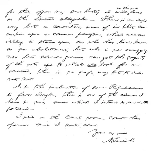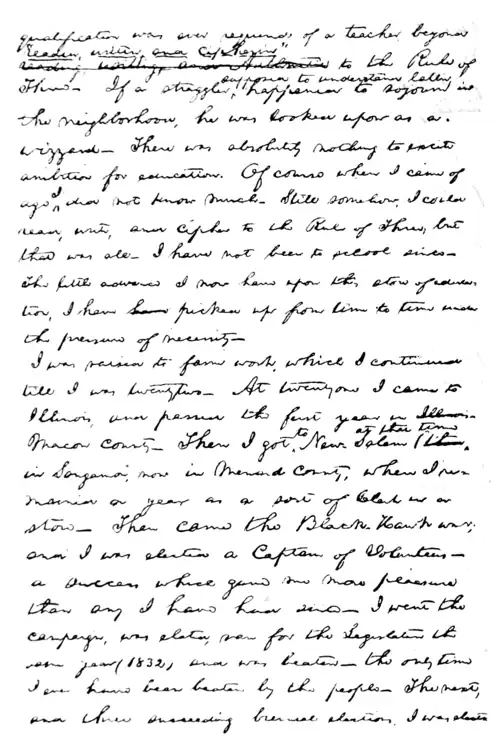 I was raised to farm work, which I continued till I was twenty two— At twenty one I came to Illinois, and passed the first year in Macon county— Then I got to New-Salem at that time in Sangamon, now in Menard county, where I remained a year as a sort of Clerk in a store— Then came the Black Hawk war; and I was elected a Captain of Volunteers— a success which gave me more pleasure than any I have had since— I went the campaign, was elected, ran for the Legislature the same year (1832) and was beaten— the only time I ever have been beaten by the people— The next, and three succeeding biennial elections, I was elected to the Legislature— I was not a candidate afterwards. During this Legislative period I had studied law, and removed to Springfield to practice it— In 1846 I was once elected to the lower House of Congress— Was not a candidate for re-election— From 1849 to 1854, both inclusive, practiced law more assiduously than ever before— Always a whig in politics; and generally on the whig electoral tickets, making active canvasses— I was losing interest in politics, when the repeal of the Missouri Compromise aroused me again— What I have done since then is pretty well known—