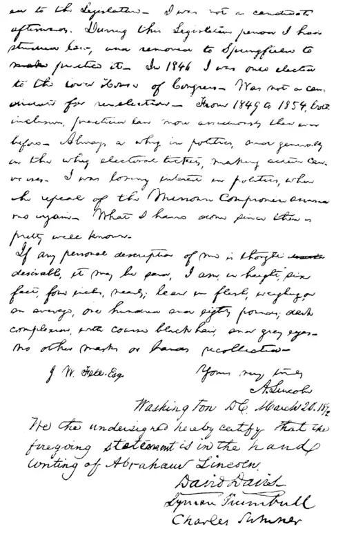- ↑ The circumstances under which the original preceding sketch was written are explained in the following letter:—Colonel Ward H. Lamon:Dear Sir,—In compliance with your request, I place in your hands a copy of a manuscript in my possession written by Abraham Lincoln, giving a brief account of his early history, and the commencement of that political career which terminated in his election to the Presidency.It may not be inappropriate to say, that some time preceding the writing of the enclosed, finding, in Pennsylvania and elsewhere, a laudable curiosity in the public mind to know more about the early history of Mr. Lincoln, and looking, too, to the possibilities of his being an available candidate for the Presidency in 1860, I had on several occasions requested of him this information, and that it was not without some hesitation he placed in my hands even this very modest account of himself, which he did in the month of December, 1859.To this were added, by myself, other facts bearing upon his legislative and political history, and the whole forwarded to a friend residing in my native county (Chester, Pa.),—the Hon. Joseph J. Lewis, former Commissioner of Internal Revenue,—who made them the basis of an ably-written and somewhat elaborate memoir of the late President, which appeared in the Pennsylvania and other papers of the country in January, 1860, and which contributed to prepare the way for the subsequent nomination at Chicago the following June.Bettering this brief and unpretending narrative, written by himself in his own peculiar vein,—and in justice to him I should add, without the remotest expectation of its ever appearing in public,—with the attending circumstances, may be of interest to the numerous admirers of that historic and truly great man, I place it at your disposal.